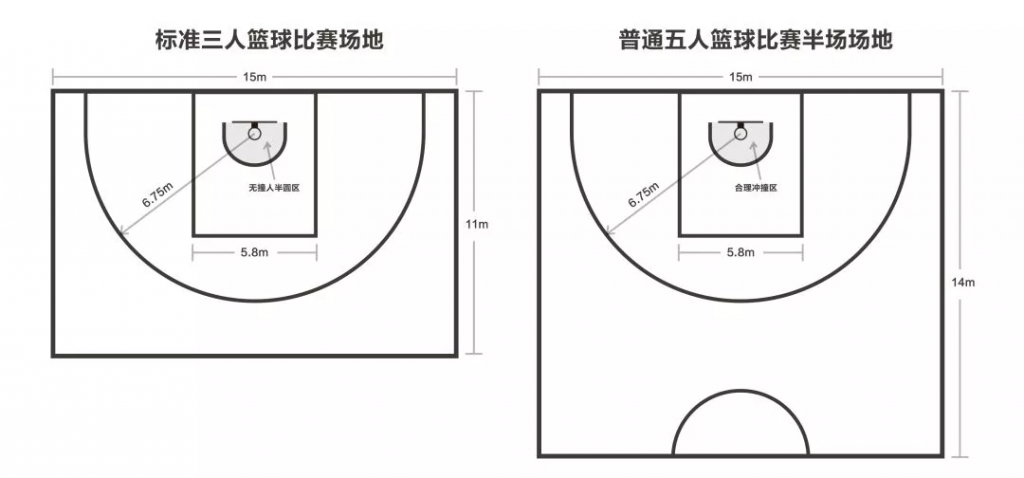 標(biāo)準(zhǔn)的三人籃球比賽場(chǎng)地并不是人們傳統(tǒng)意識(shí)中的普通五人籃球的半場(chǎng),雖然二者寬度相同,但從比賽場(chǎng)地的長(zhǎng)度來(lái)看,標(biāo)準(zhǔn)三人籃球比賽場(chǎng)地要比普通五人籃球的半場(chǎng)要短3米。(對(duì)比圖如下)
