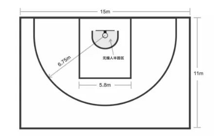 標(biāo)準(zhǔn)的三人籃球比賽場(chǎng)地面積15米(寬) ×11米(長(zhǎng));場(chǎng)地須具有一個(gè)標(biāo)準(zhǔn)籃球場(chǎng)尺寸的區(qū)域,包括一條罰球線( 5.80米)、一條兩分球線(6.75米)以及球籃正下方的一個(gè)“無(wú)撞人半圓區(qū)”。(如下圖所示)